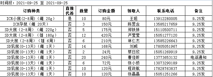 9月25日实验动物中心动物发放表