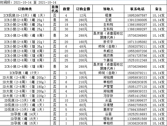 10月14日实验动物中心动物发放表