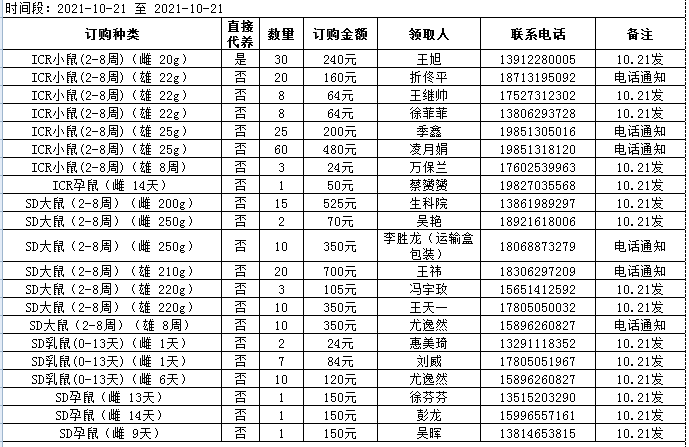 10月21日实验动物中心动物发放表