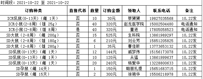 10月22日实验动物中心动物发放表