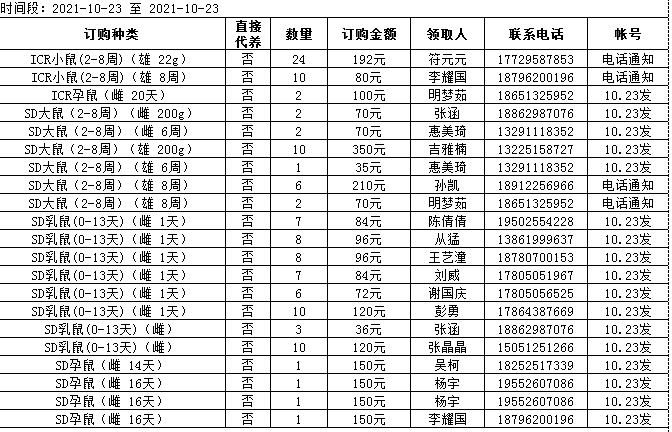 10月23日实验动物中心动物发放表