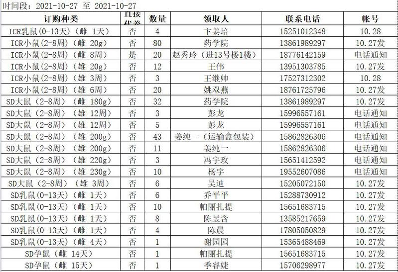 10月27日实验动物中心动物发放表