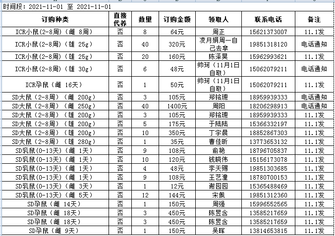 11月1日实验动物中心动物发放表