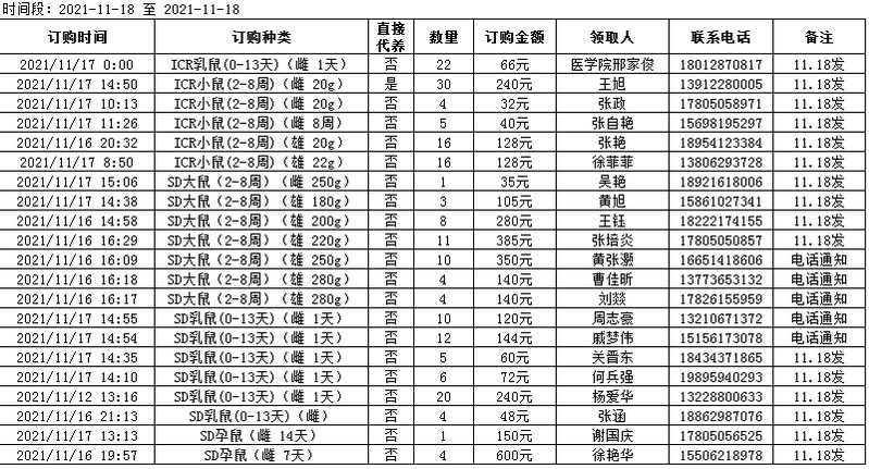 2021.11.9起大鼠孕鼠及红皮发放排序按订购时间先后进行发放,如有疑问请咨询办公室或生产部。