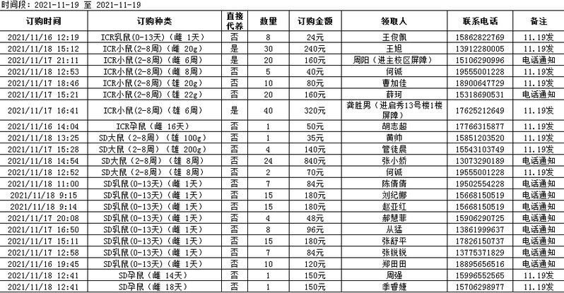 11月19日实验动物中心动物发放表