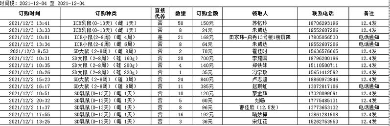 12月4日实验动物中心动物发放表