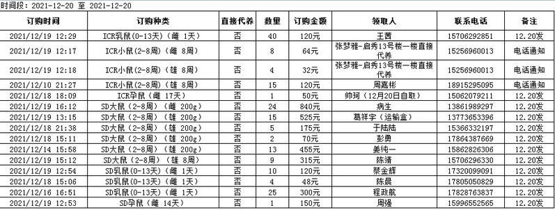 12月20日实验动物中心动物发放表