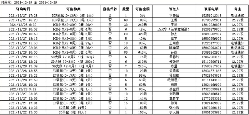 12月29日实验动物中心动物发放表