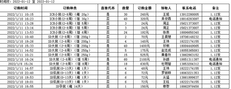 1月12日实验动物中心动物发放表