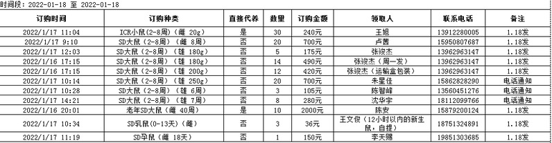 1月18日实验动物中心动物发放表