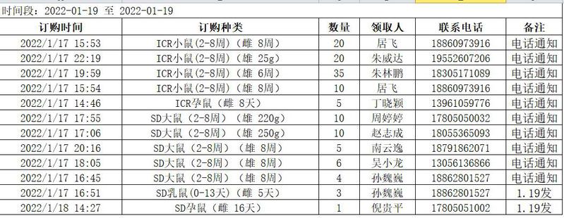1月19日实验动物中心动物发放表