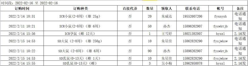 2月16日实验动物中心动物发放表