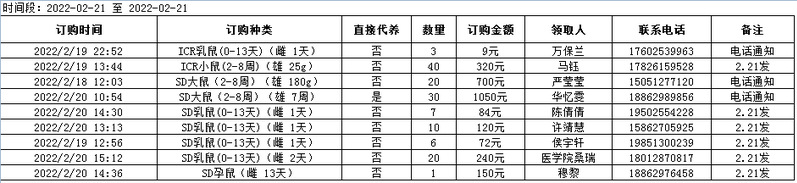 2月21日实验动物中心动物发放表