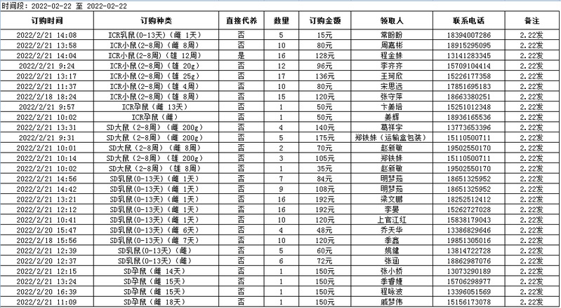2月22日实验动物中心动物发放表