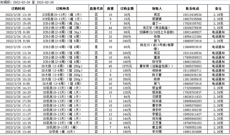 2月26日实验动物中心动物发放表