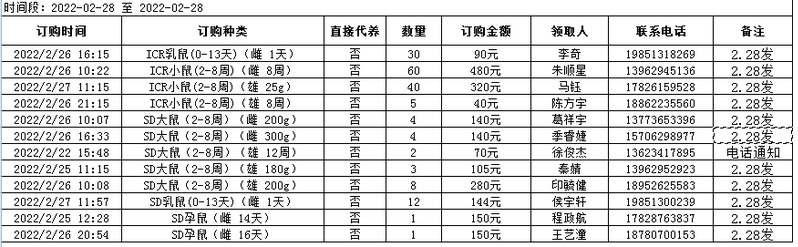2月28日实验动物中心动物发放表