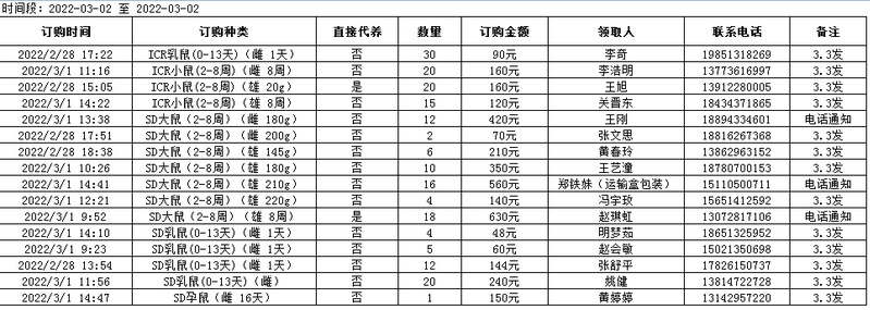 3月2日实验动物中心动物发放表