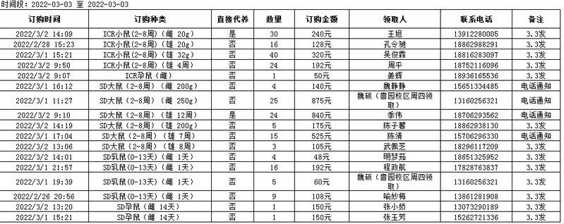 3月3日实验动物中心动物发放表