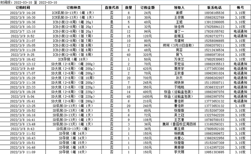 3月10日实验动物中心动物发放表