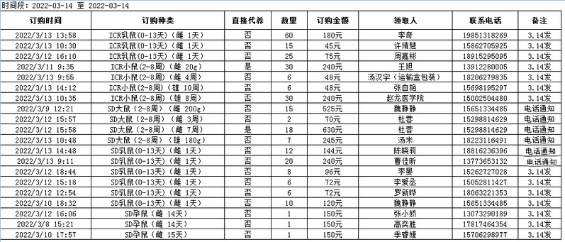 3月14日实验动物中心动物发放表