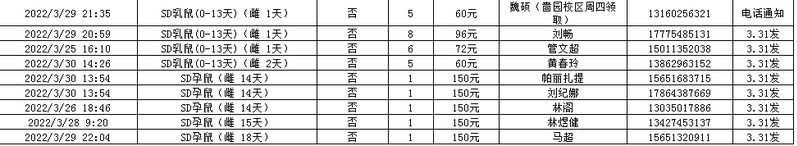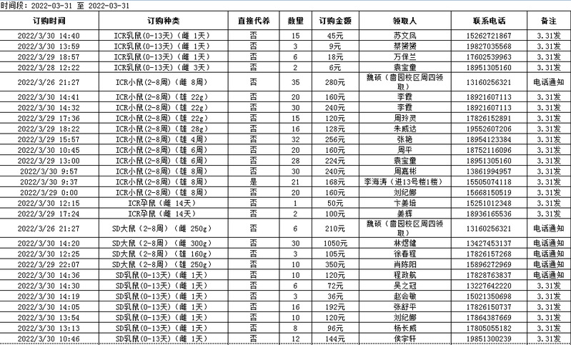 3月31日实验动物中心动物发放表