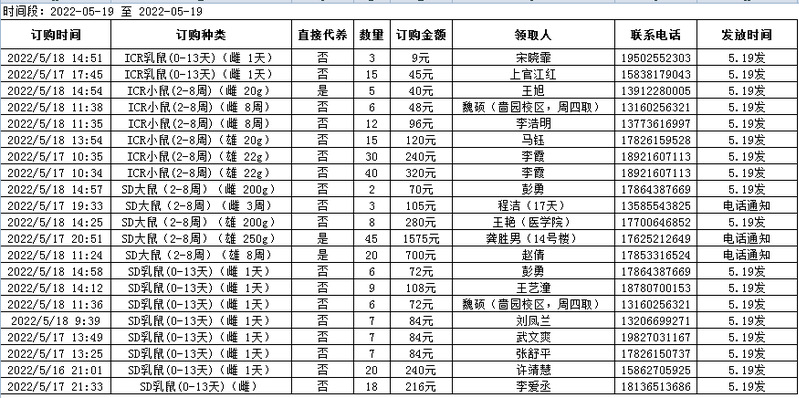 5月19日实验动物中心动物发放表