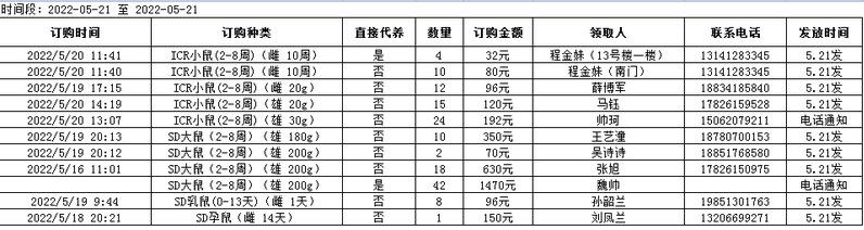 5月21日实验动物中心动物发放表