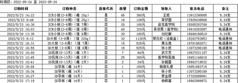 5月24日实验动物中心动物发放表