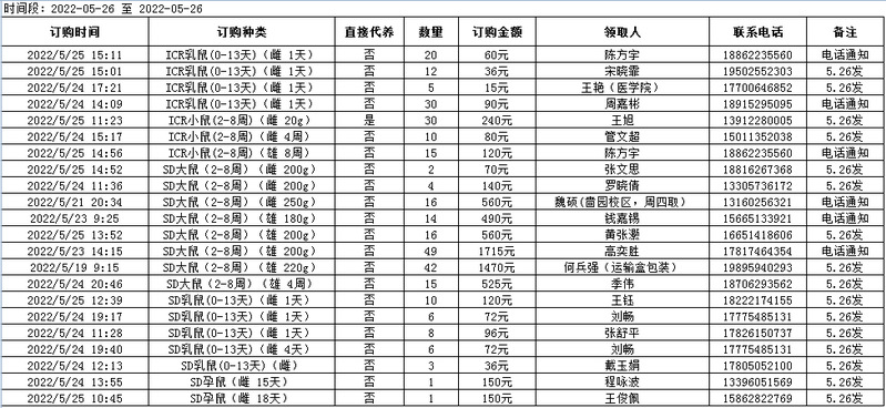 5月26日实验动物中心动物发放表