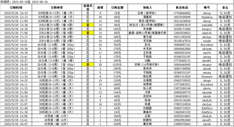 5月30日实验动物中心动物发放表