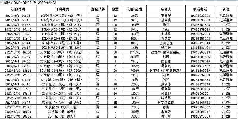 6月2日实验动物中心动物发放表