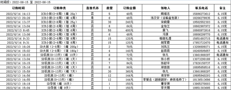 6月15日实验动物中心动物发放表