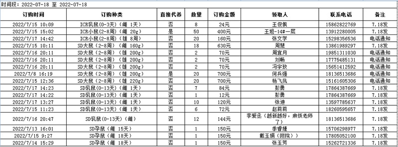 7月18日实验动物中心动物发放表