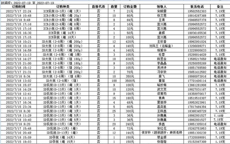 7月19日实验动物中心动物发放表