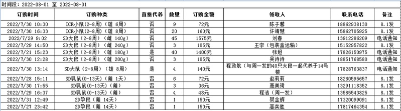 8月1日实验动物中心动物发放表
