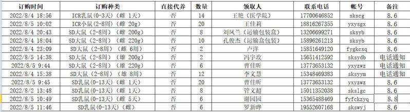 8月6日实验动物中心动物发放表