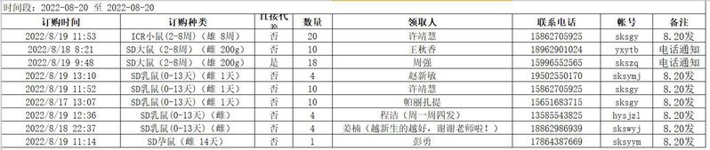 8月20日实验动物中心动物发放表