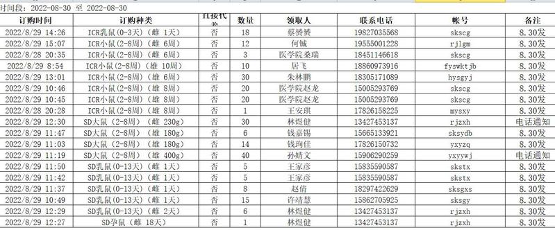 8月30日实验动物中心动物发放表