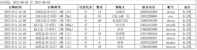 9月5日实验动物中心动物发放表