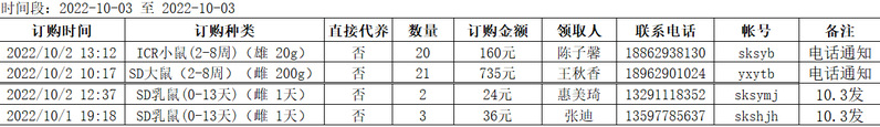 10月3日实验动物中心动物发放表
