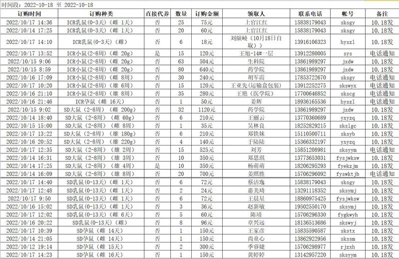 10月18日实验动物中心动物发放表