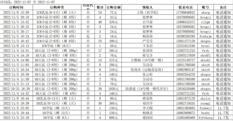 11月7日实验动物中心动物发放表