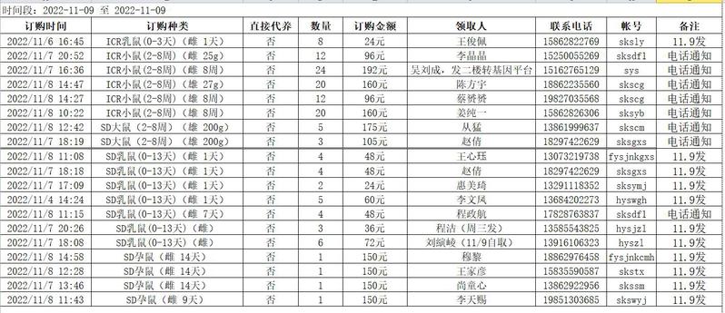 11月9日实验动物中心动物发放表