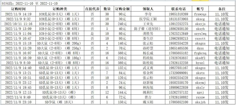 11月10日实验动物中心动物发放表