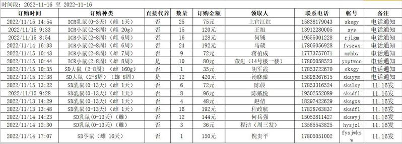 11月16日实验动物中心动物发放表