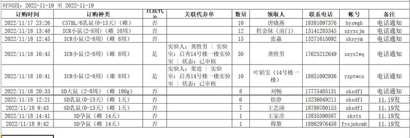 11月19日实验动物中心动物发放表