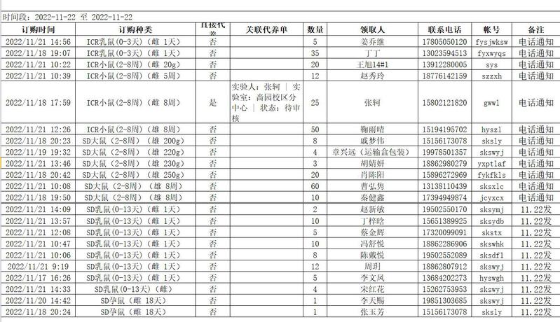 11月22日实验动物中心动物发放表