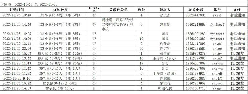 11月26日实验动物中心动物发放表