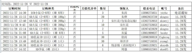 11月28日实验动物中心动物发放表