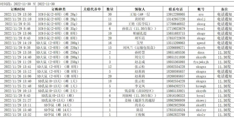 11月30日实验动物中心动物发放表
